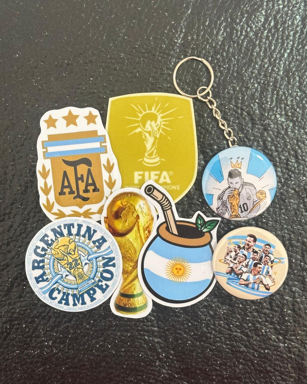 Descubre el Pack Regalo Souvenir Stickers+Pin+Llavero Messi Argentina, una colección perfecta para los amantes del fútbol y los seguidores de la Selección Argentina. Este pack incluye 5 stickers de alta calidad, 1 pin y 1 llavero, todos diseñados con la esencia del ícono del deporte, Lionel Messi y la Selección Argentina de Fútbol.